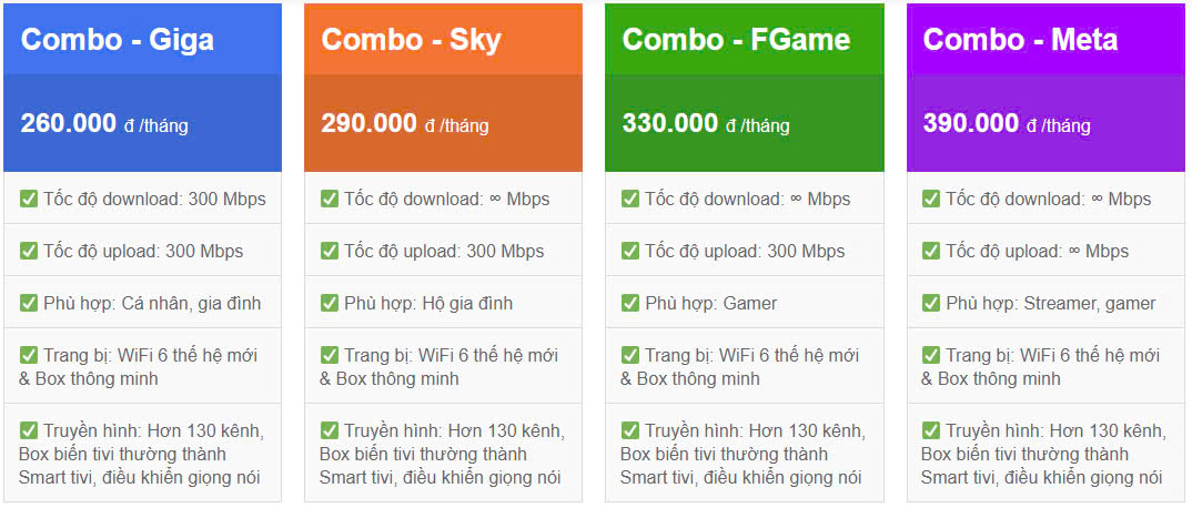 2. Bảng giá Combo Truyền hình và Internet FPT